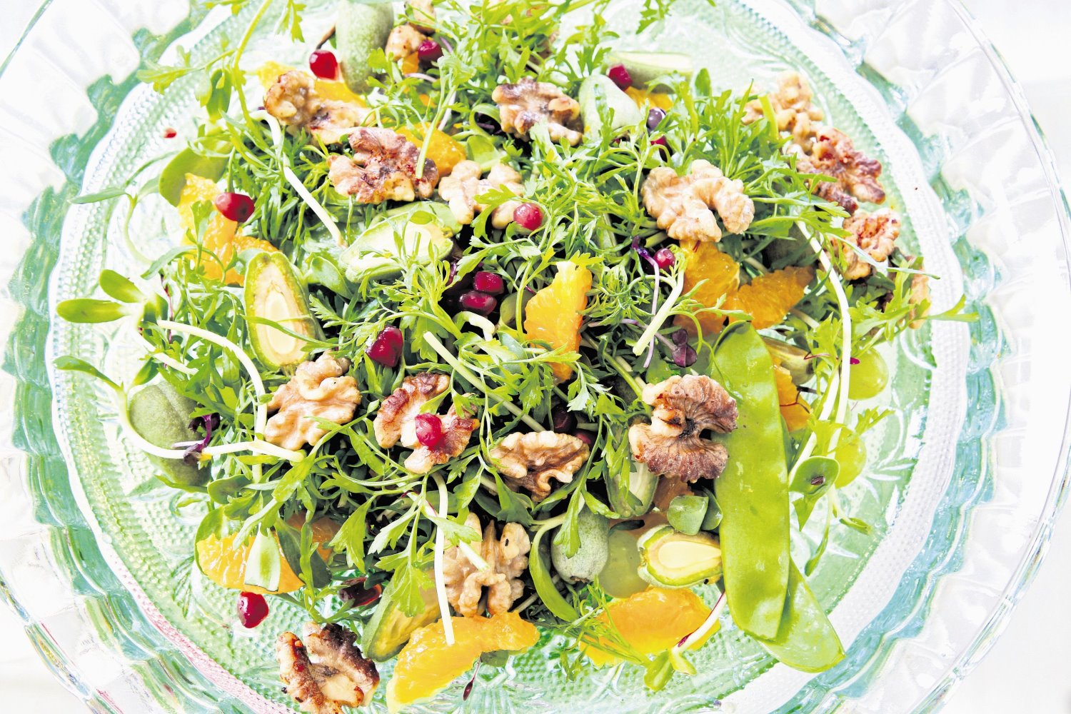 מסדרים את כל סוגי הירקות על צלחת הגשה (בלי לערבב). לקראת ההגשה מתבלים, מוסיפים את הפילטים של הקלמנטינות ומפזרים מעל הכול את אגוזי המלך וגרגירי הרימון.