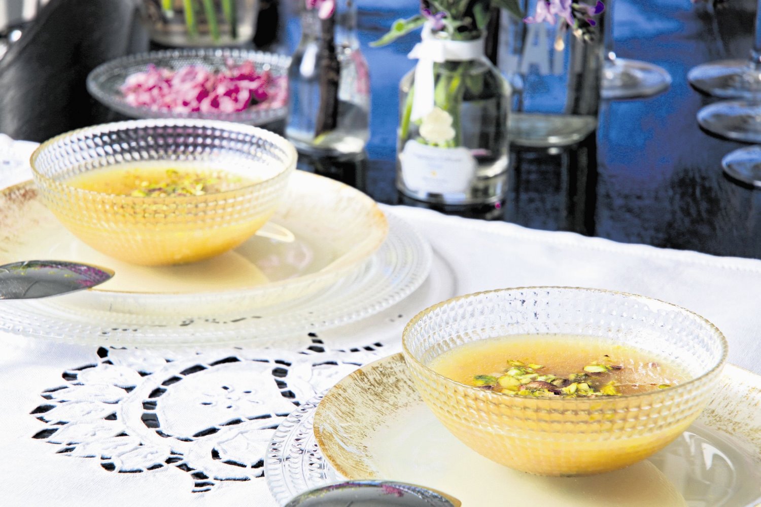 מחממים את השמן בסיר עמוק. מוסיפים את הכרשה, הבצל והשום ומטגנים עד שהם שקופים. מוסיפים את הקורנפלור ומערבבים יחד במשך דקה-שתיים כדי שלא יהיו גושים. מוסיפים את ציר העוף תוך כדי ערבוב, מפזרים את הפיסטוקים ומביאים לרתיחה. מנמיכים את האש וממשיכים בבישול על אש קטנה עוד כחצי שעה. מוסיפים את מיץ התפוזים, מערבבים, מביאים לרתיחה, מנמיכים את האש וממשיכים עוד כחמש דקות. מגישים חם עם מעט גרידת תפוז מעל. אפשר להכין את המרק מראש ולחמם לפני ההגשה.
