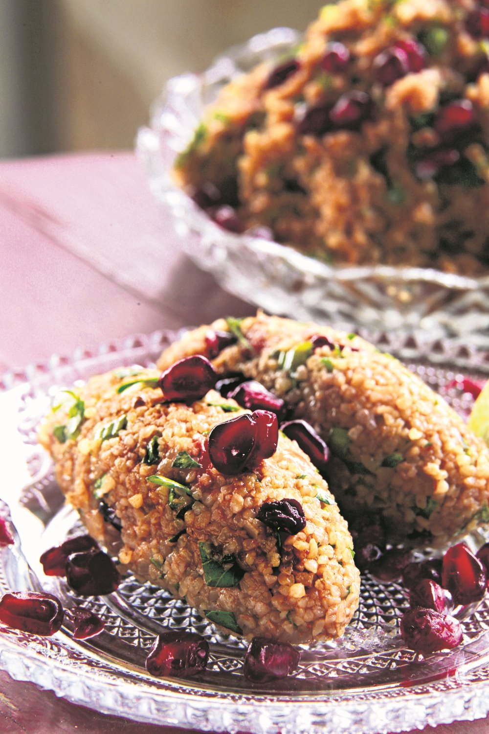 לשים את התערובת היטב, כ־5 דקות, ורק כשהתערובת מגובשת יפה מוסיפים את הירוקים הקצוצים, כולל העגבניות הטריות, הכמון, מיץ הלימון, רכז הרימונים וכחצי מגרגירי הרימון (החצי הנותר לקישוט בעת ההגשה) ומערבבים.