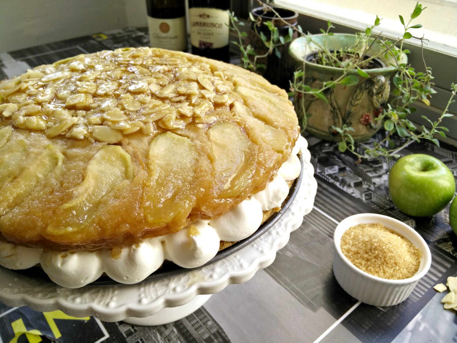 9.מרכיבים את העוגה: מזלפים את קרם הווניל על חצי העוגה ללא התפוחים. לוקחים את חצי העוגה עם התפוחים והקרמל, והופכים בזהירות מעל קרם הוניל כך שהצד של התפוחים יהיה העליון (אפשר להיעזר בצלחת). מסירים את נייר האפייה מעל החלק העליון של העוגה. מניחים את השקדים המקורמלים שנותרו במחבת במרכז העוגה (אם הקרמל טיפה התמצק, מחממים שנית ואז יוצקים מעל מרכז העוגה). מגישים או שומרים במקרר בכלי אטום עד 3 ימים.