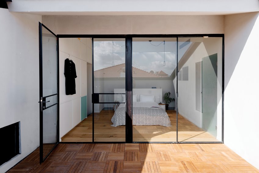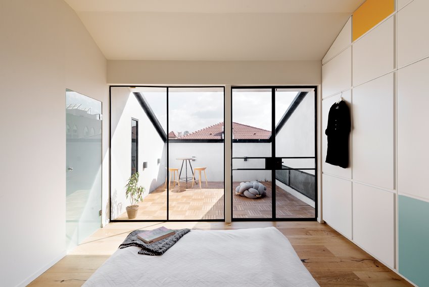 מבט מחדר השינה החוצה, דרך דלתות זכוכית ממוסגרות בפרופיל בלגי שחור, מאפשר להשקיף על השכונה היפואית ולהכניס שפע של אור פנימה. צילום: גדעון לוי