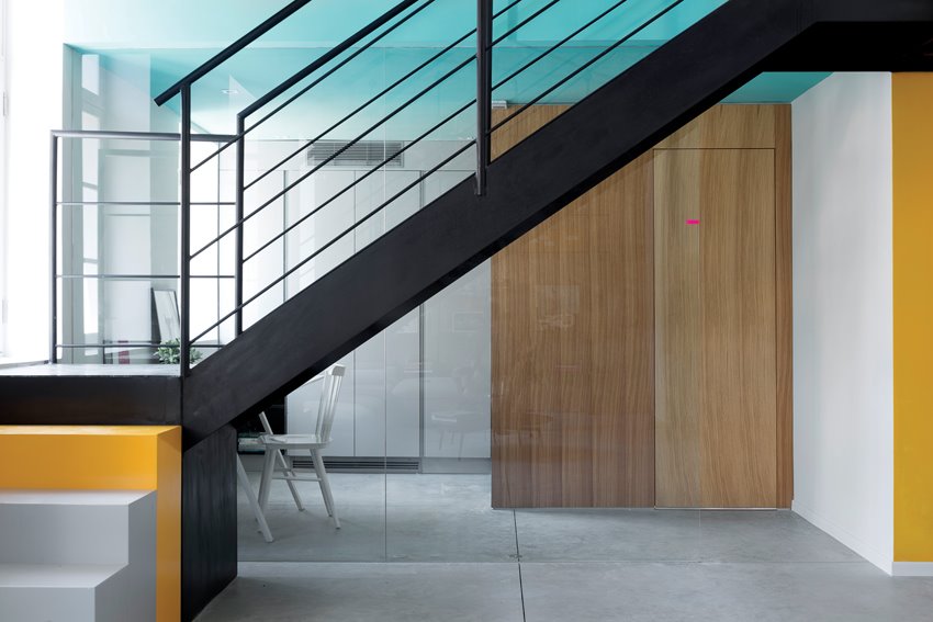 גרם המדרגות שמתנשא לגובה חמישה מטרים, הוגדר כאלמנט מרכזי בעיצוב הדירה, ובמקום לנסות ולטשטש את נוכחותו, בחרו שטיינפלד ודביר, בהנחיית האדריכל אמיר נבון, להדגיש באמצעותו את החלוקה בין החלל הציבורי לפרטי . צילום: גדעון לוי.