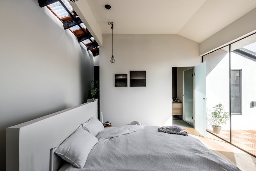 חדר המאסטר שנבנה במקום חלק מגג הרעפים שפורק, עוצב בסגנון מודרני מינימליסטי, תוך ניצול מקסימאלי של השטח הנתון . צילום: גדעון לוי