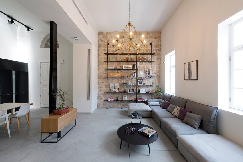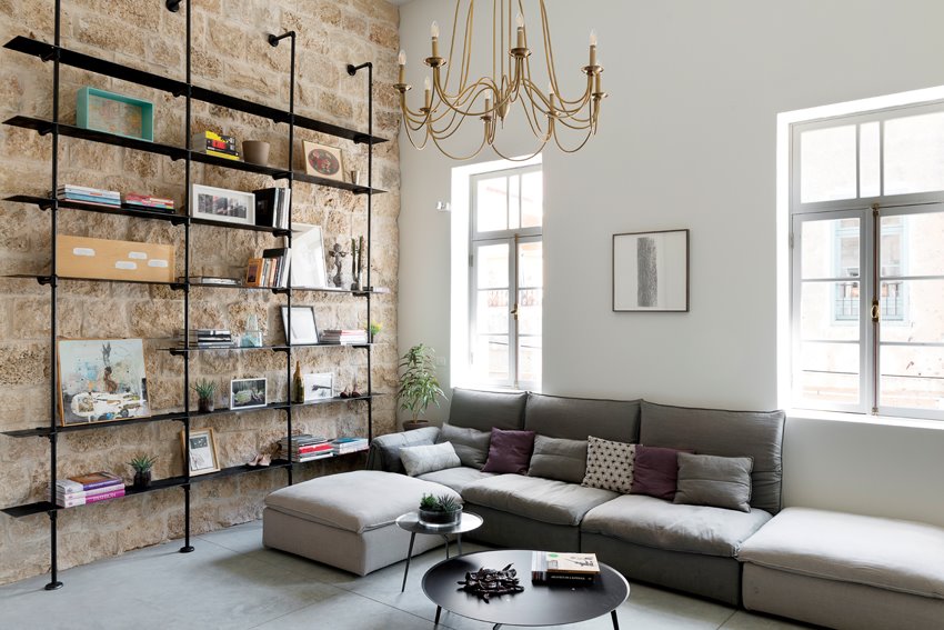 מבט לסלון - קיר לבנים נחשף במלוא הדרו בלב הסלון העכשווי ומעניק תחושת שייכות לשכונה היפואית. צילום: גדעון לוי