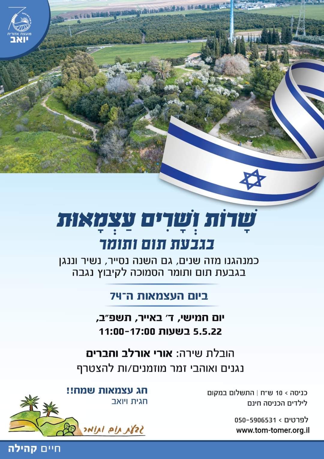 יום העצמאות 5.5.22 בשעות 1100-1700 מוזמנים להגיע לסייר לשיר ולנגן בגבעת תום ותומר בקיבוץ נגבה עלות כניסה 10 ש"ח ילדים כניסה חינם .