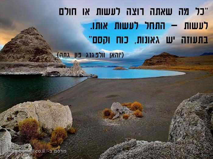 שוב שקט. נזכרת במשפט של גתה שחבר שלח לי בהקשר אחר לגמרי: "כל מה שאתה יכול לעשות, או לחלום שאתה יכול – התחל אותו. בהעזה יש גאוניות, עוצמה וקסם. התחל עכשיו״.