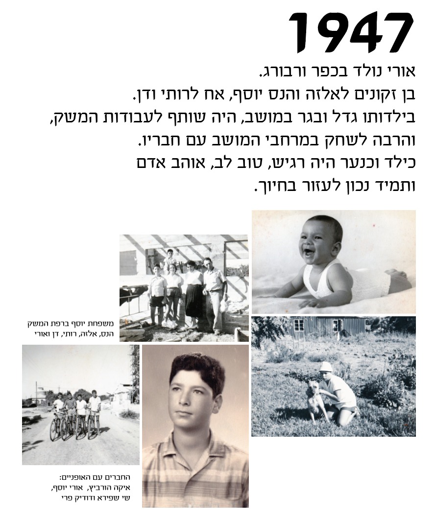 אורי יוסף ז״ל, נולד בדיוק היום (שלישי ערב יום הזכרון), 13.4.1947 בכפר ורבורג. בן זקונים להוריו - הנס ואלזה ז״ל, ״יקים״ שהגיעו ארצה מגרמניה, אח של דן ורות.