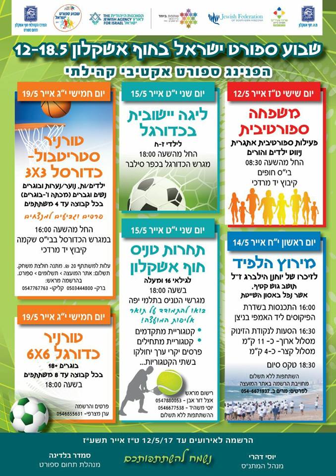 בתאריכים 12.5-19.5 יתקיים שבוע ספורט אקטיבי לתושבי חוף אשקלון. הפעילות מיועדת לכל המשפחה וכוללת: