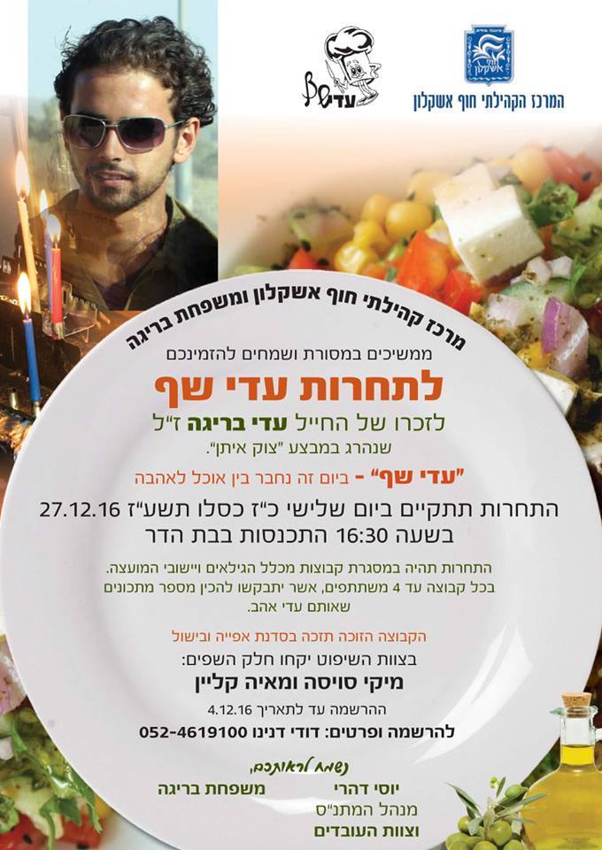 מרכז קהילתי חוף אשקלון ומשפחת בריגה מזמינים אתכם לתחרות מאסטר שף לזכרו של עדי בריגה ז"ל המתקיים מדי שנה בחג החנוכה.
