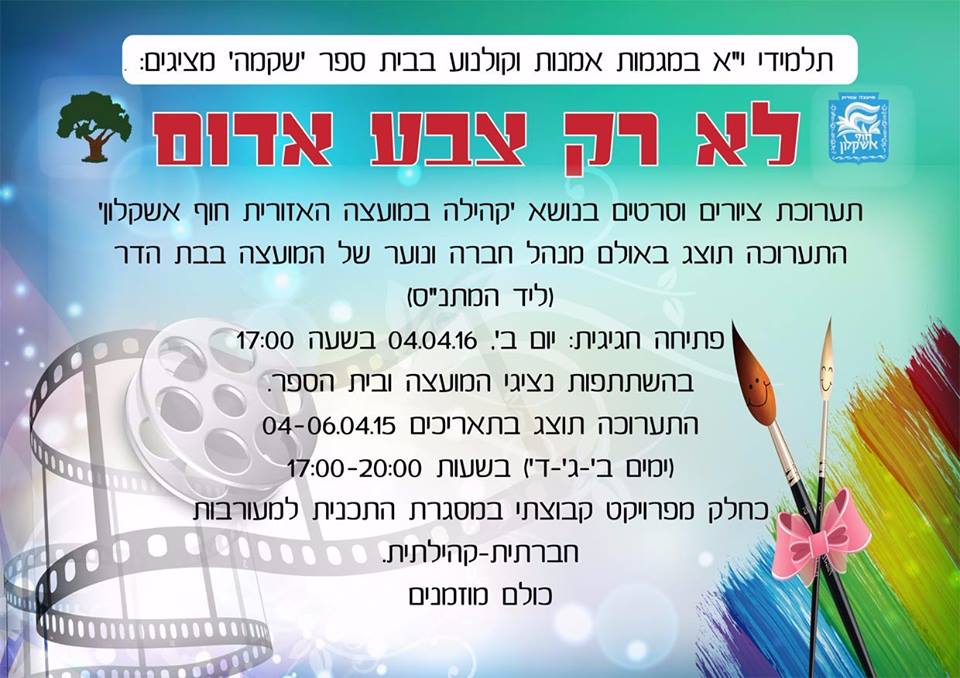 "חוף אשקלון - המועצה שלי" סרטה של עדי פלד, אשר יוצג בתערוכה: 'לא רק צבע אדום - תלמידי 'שקמה' מאירים את חוף אשקלון בצבעים וסרטים' אשר תיפתח ביום שני הקרוב, 4.4, ב17:00, באולם 'מנהל חברה ונוער' שבמועצה האזורית חוף אשקלון. כולם מוזמנים.