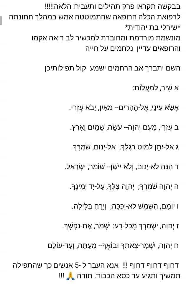 היא ביתם ד״ר שירלי אריאלי, האשקלונים, יוסי ויהודית משפחתה ביקשה שיתפללו בשבילה וכך הם כתבו: