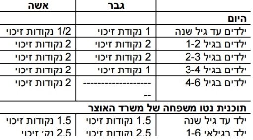 נשים זכאיות לחצי נקודה עם הולדת הילד, ועם הגיעו לגיל שנה ועד גיל 6 הן זכאיות לשתי נקודות בעבור כל שנה.