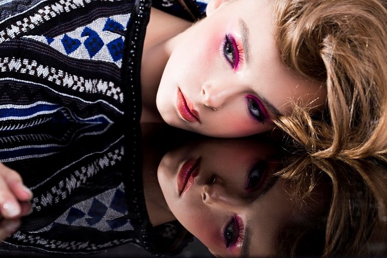איפור: בסיס מייק-אפ עם נגיעות של הברקה במקומות הגבוהים בפנים. צלליות מט מטושטשות בגווני ורוד-פוקסיה וכתום-תפוז עם נגיעות של גלוס. מראה שפתיים "לא עשוי", הנחה מרושלת וכיתמית של שפתונים בגווני הצללית.