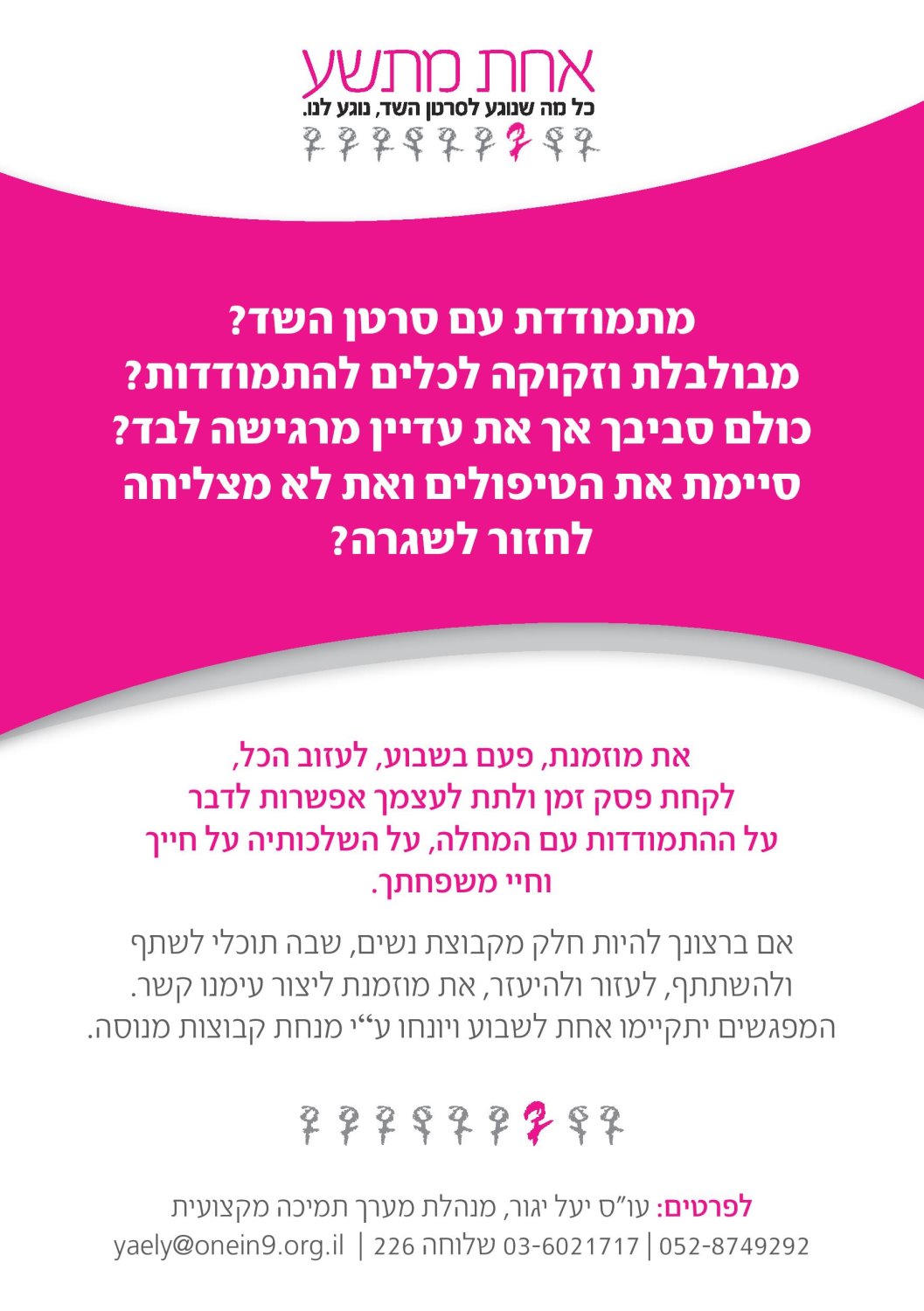 עמותת "אחת מתשע" פותחת קבוצות תמיכה לנשים המתמודדות עם סרטן השד באזור הדרום