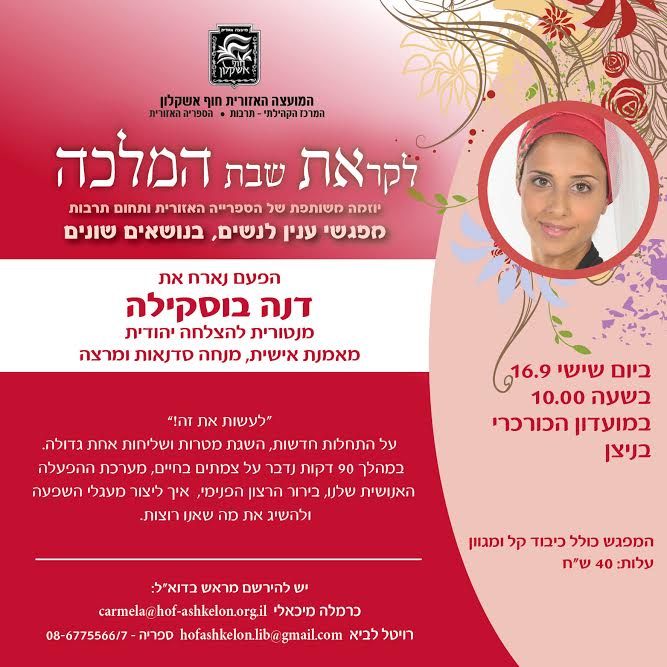 לקראת שבת המלכה- מפגש עניין נשי עם דנה בוסקילה, מנטורית להצלחה יהודית. יום ו' 16/9, 10:00 במועדון הכורכרי בניצן. 40 ₪ כולל ארוחת בוקר.