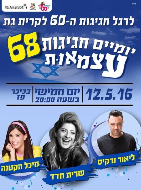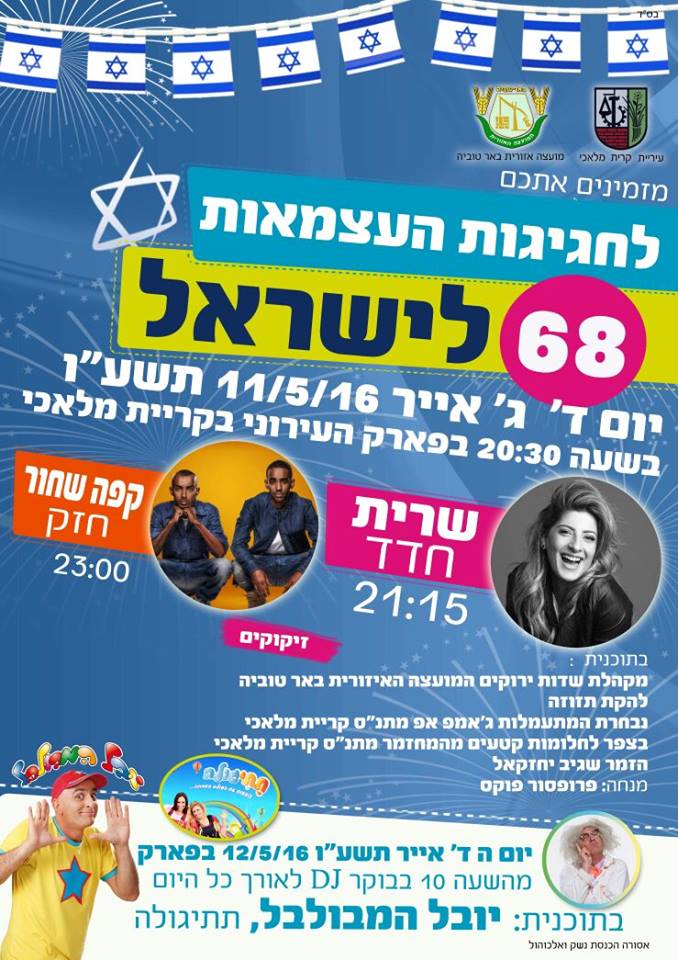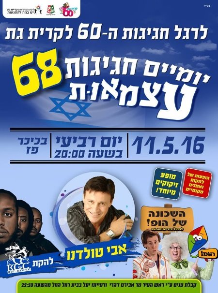 אירועי ערב יום העצמאות 68 בקרית גת יתקיימו החל מ-20:00 כל ההופעות יתקיימו בבמה המרכזית ליד המתנ"ס (פארק פ"ז):