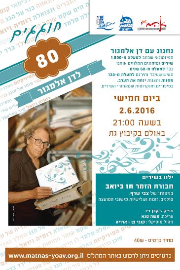 ביום חמישי הקרוב יערך מופע חגיגי עם דן אלמגור , הפזמונאי שכתב למעלה מ1500 שירים ופזמונים במשך 60 שנה.ילוו בשירים חבורת הזמר תו ביואב.בשעה 21:00 קיבוץ גת.