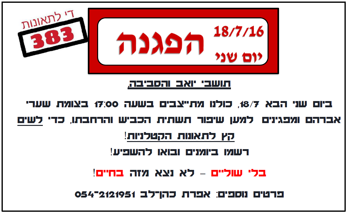 צביקה קורא לתושבי הסביבה לבוא להפגנה שתתקיים ביום שני 18/7/16 בשעה 17:00 בצומת שערי אברהם.